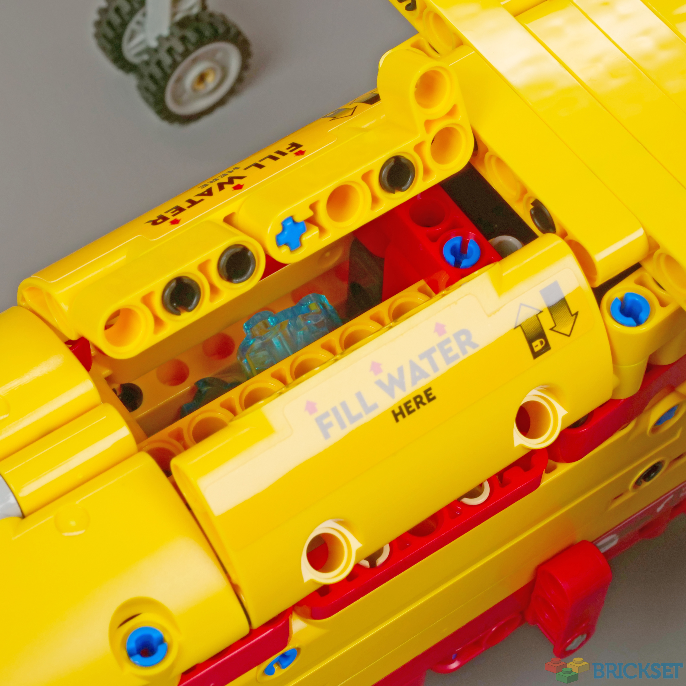 The main play feature is discharging ten 2x2 round bricks of 'water', which are loaded into an opening bay at the top of the body, and discharged by moving a lever on the side. The chute is spring-loaded so shuts tightly closed when you move the lever back again.