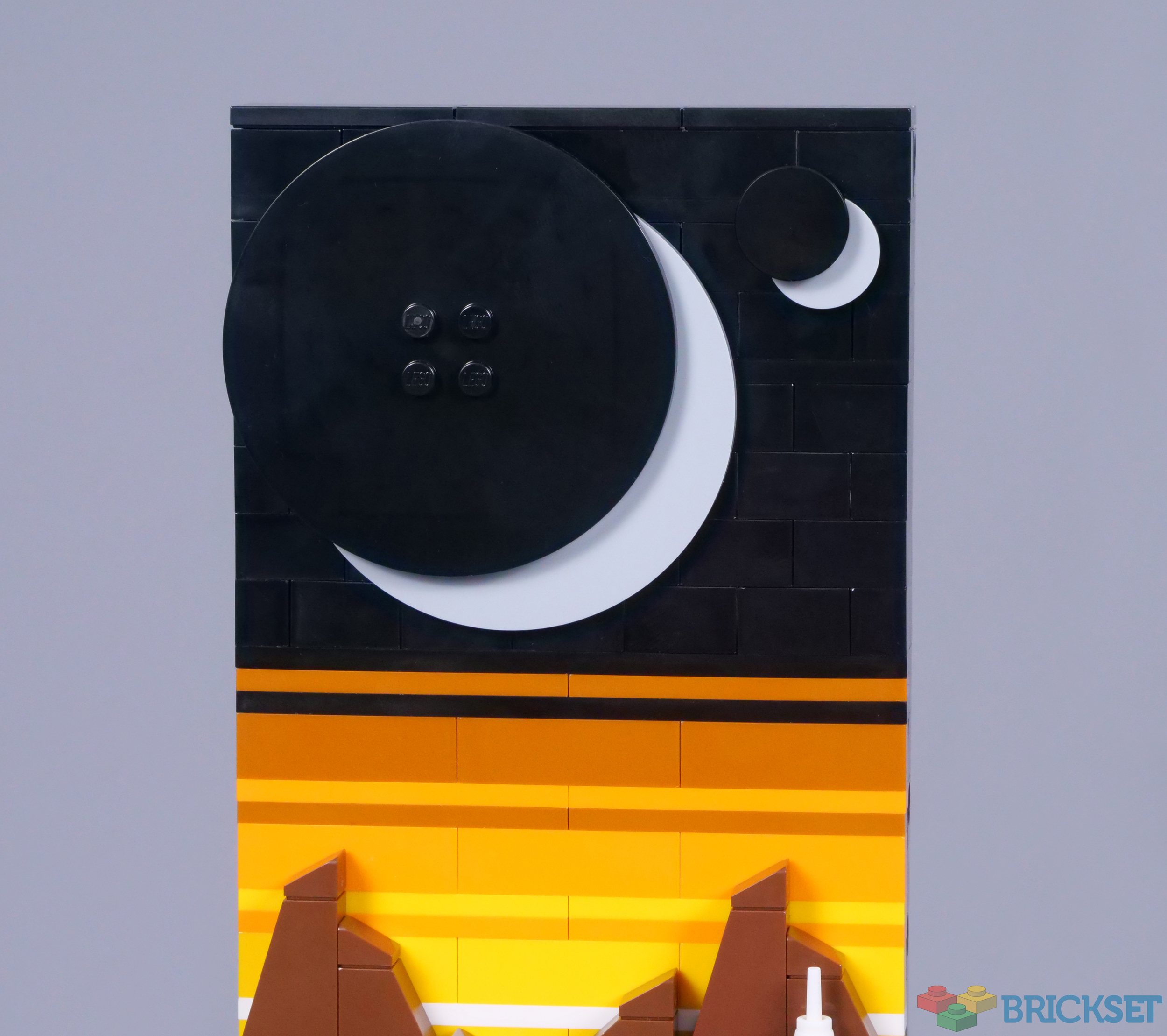However, the most appealing features are undoubtedly the moons, partly illuminated or even eclipsed by the planet. Stacking 8x8 round tiles with four studs and 2x2 round tiles is very successful, especially since the light bluish grey pieces clearly stand out against the dark backdrop. In addition, depending on the light source, the uppermost elements cast a shadow, which only makes the moons seem more realistic!