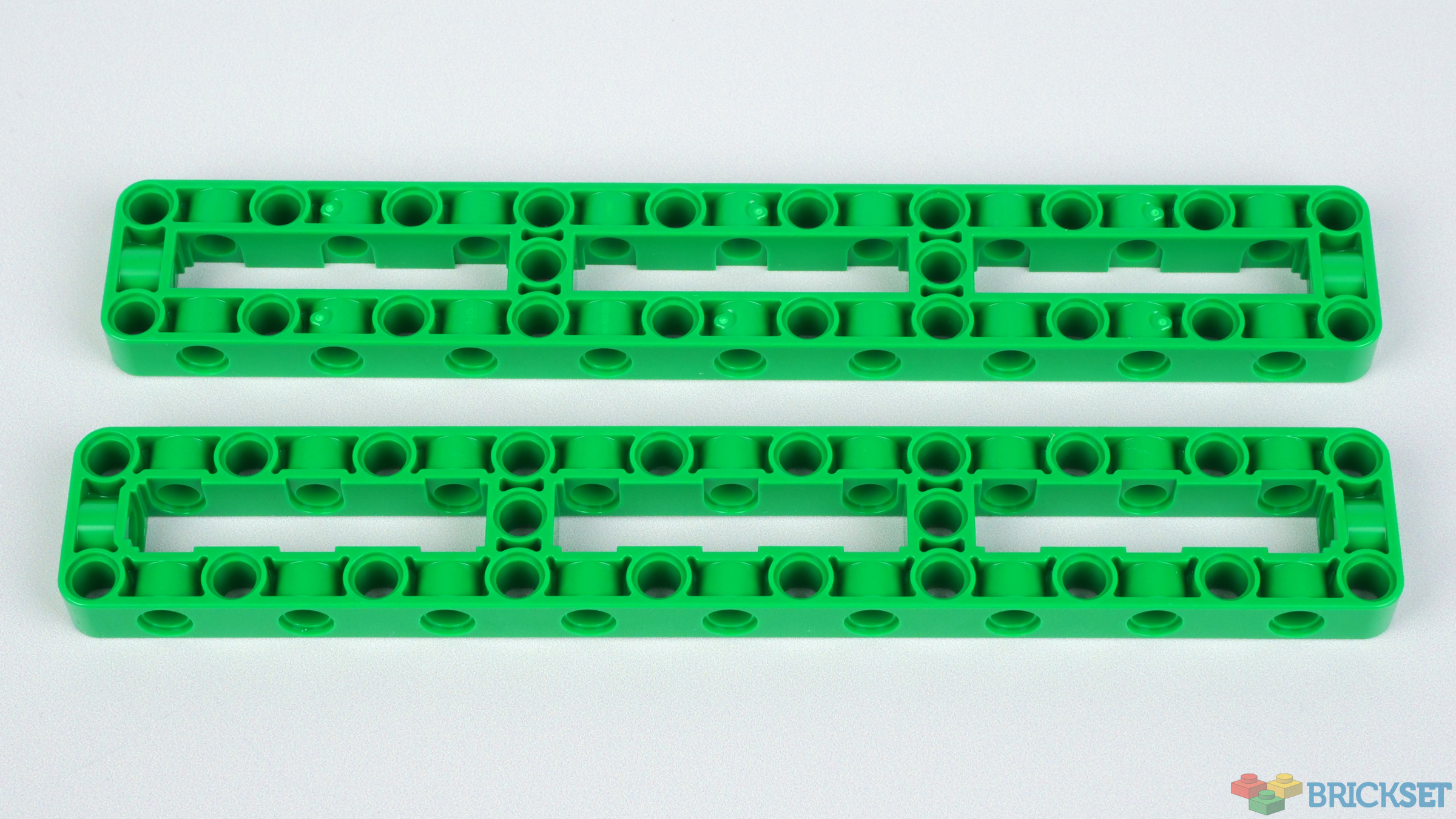 There are a couple of new parts and a large number of pieces appearing in green for the first time, including these relatively new 3x19 frames. Green is the least used of the primary colours in Technic sets so an expansion of the palette of parts available in that colour is always welcome.
