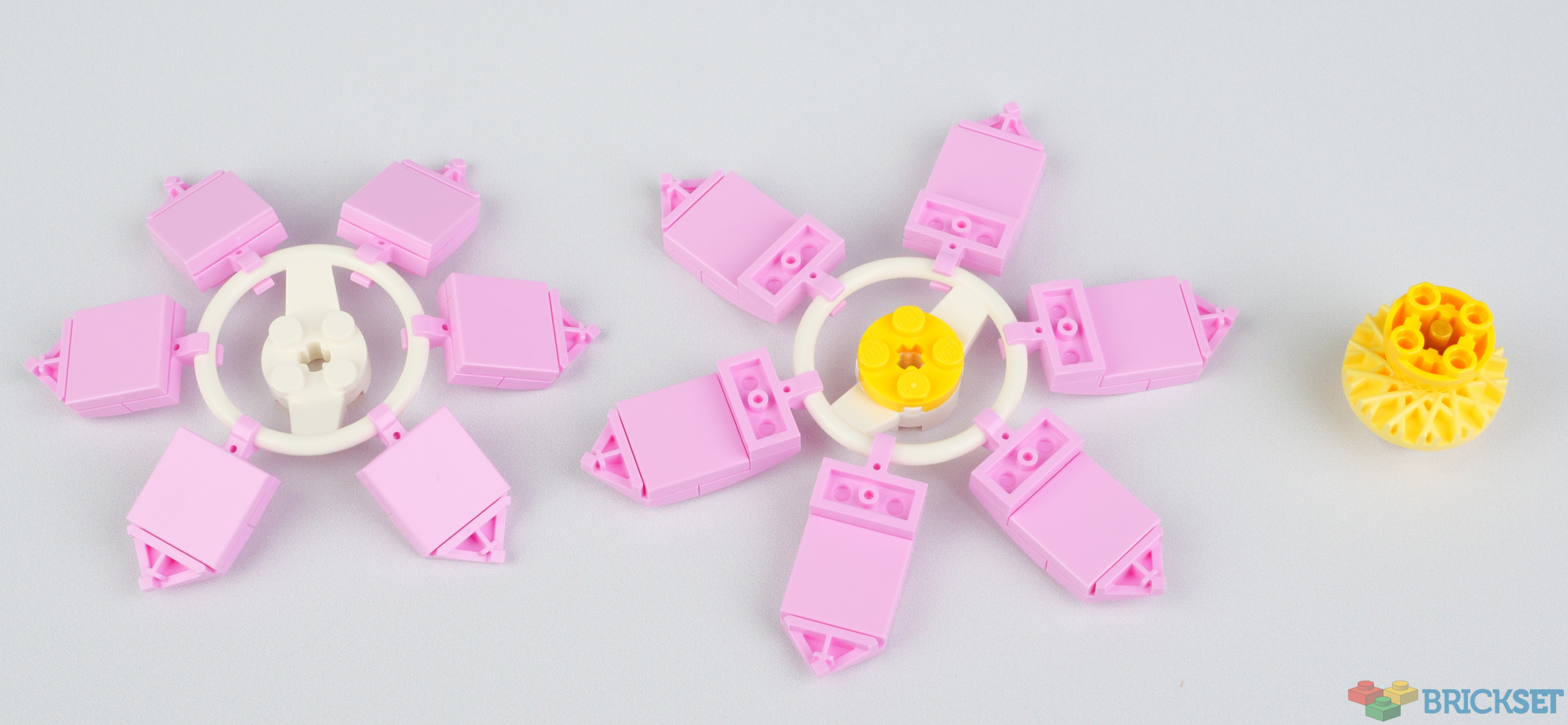The 66956 PLATE W/ BOW 2X2X2/3, 45 DEG. on the ends of the petals are new in pink, while the cool yellow hubcap, which adds delicate detail to the stamen, was also used for the same purpose in 10313 Wildflower Bouquet.
