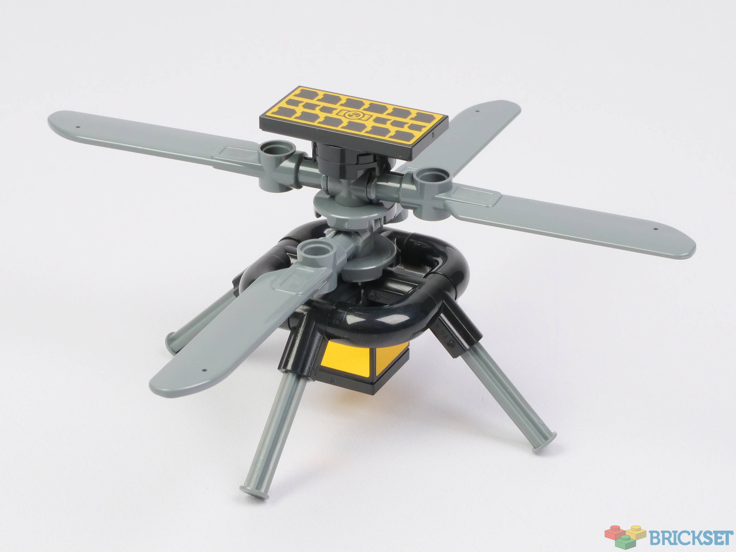 In addition to the rover, a drone -- named Ingenuity, I'm told -- is also provided, equipped with a stickered solar panel on the top and some sort of sensor below, which is a 2x2 brick and tile covered with gold stickers. It's a shame they are not drum lacquered gold pieces.