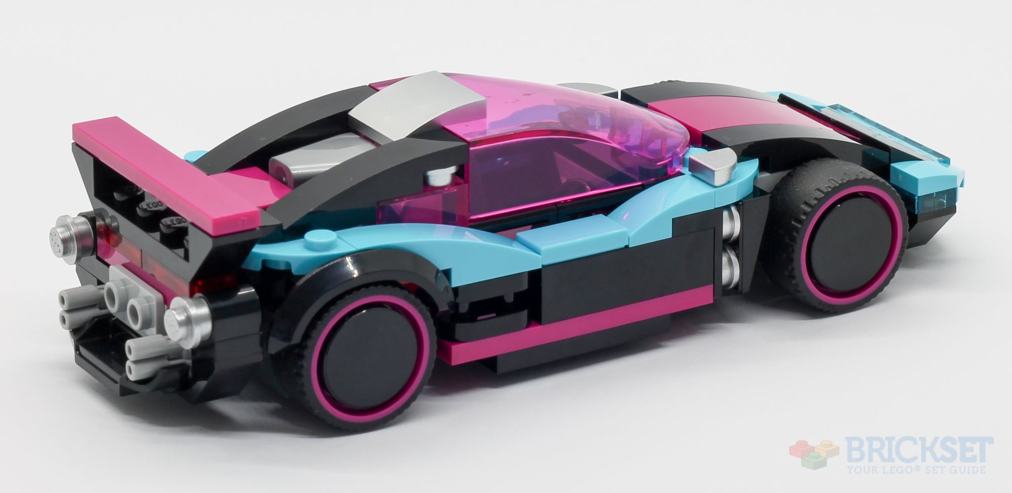 The wheels make use of the relatively recent dual-moulded part, new to this set in its fourth colour. Here, 2x2 round tiles clip over the rims perfectly to create a very slick look. Once again, silver accents are dotted around the vehicle, and a pink spoiler is attached above the rear lights and exhaust cluster.