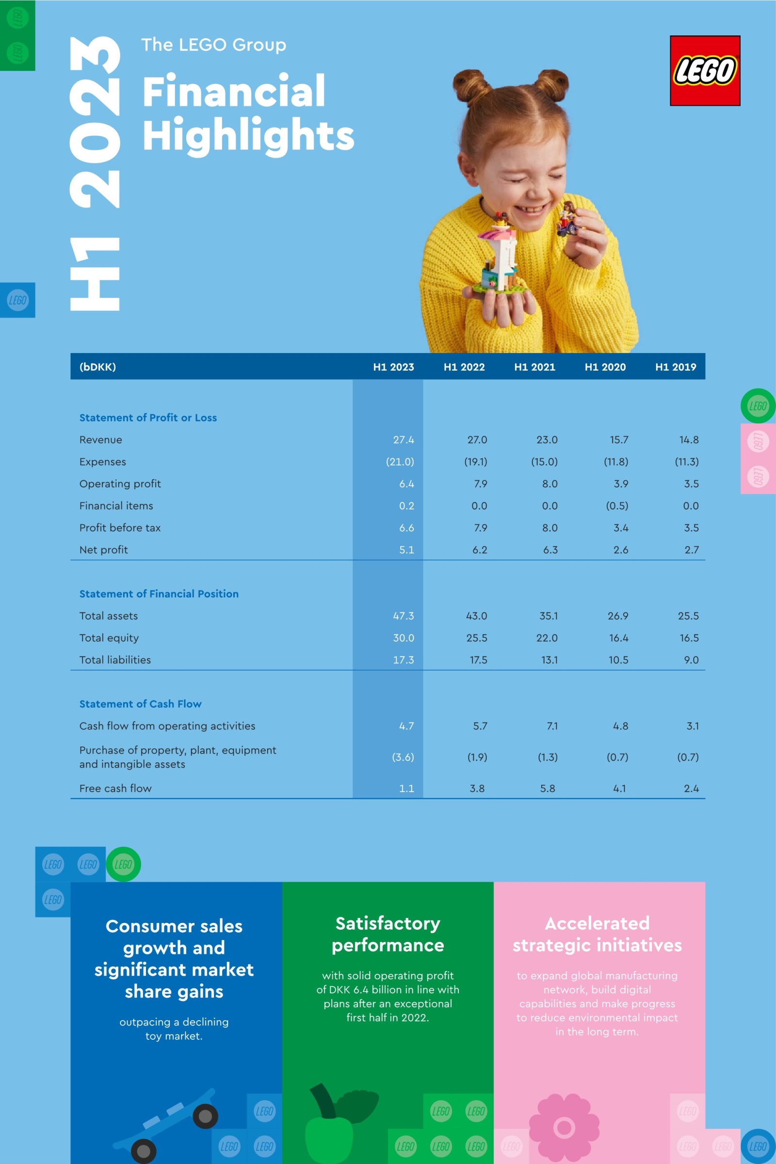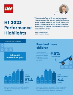 BILLUND, August 30, 2023: The LEGO Group today announced earnings for the first six months of 2023. Revenue was DKK 27.4 billion, a growth of one percent compared with H1 2022. Consumer sales grew three percent outperforming a declining toy market and contributing to strong market share growth.
