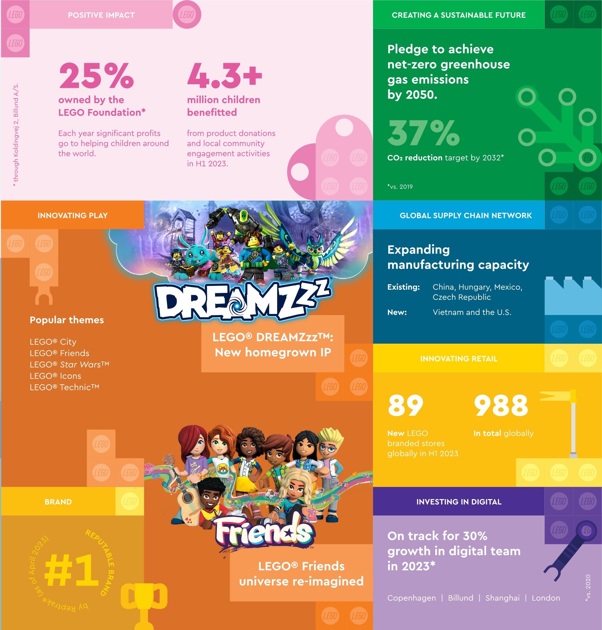 The top performing themes in the first half were a mix of homegrown IPs and external IPs and included: LEGO Icons, LEGO Star Wars, LEGO Technic and LEGO City. LEGO DREAMZzz, the company’s new homegrown IP, was launched in March, with content featured across all major streaming and kids content platforms to build awareness before products went on sale in August.