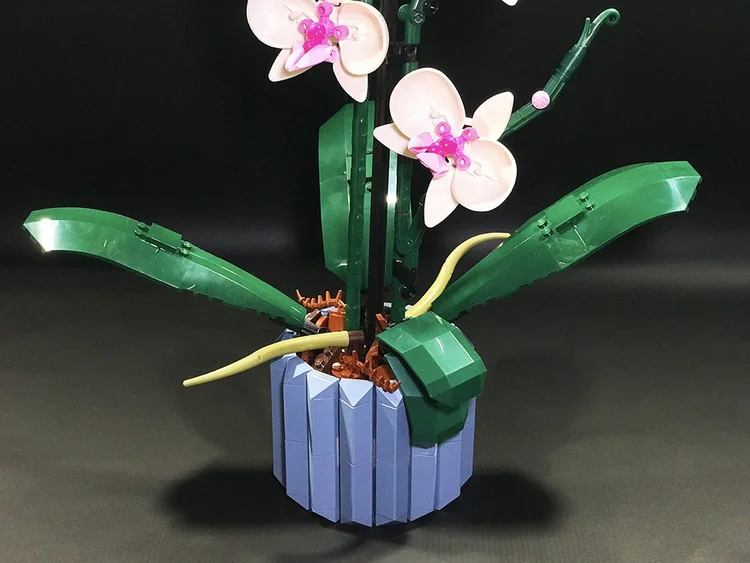 From close-up of the flowers, we can see the LEGO designer is quite successful in creating the orchid. I quite like this orchid. It is suitable to be displayed at home and add aesthetic value as decoration. And as a plus point, this orchid set already includes the blue vase which is a terrific idea.